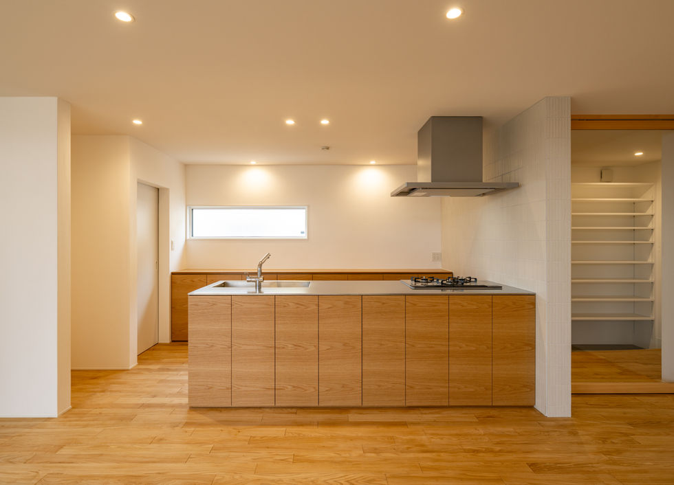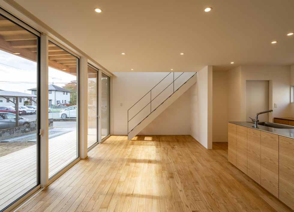 内部空間は、ナラの突板を使用した造作キッチンを軸に、床には栗のフローリング、壁は漆喰塗りとして木と白を基調として夫婦が醸し出す温和な雰囲気と空間が一体となるようにナチュラルに仕上げている。この住宅に限ったことではないが、一点豪華主義ではなく、こだわっている材料に対して安価に抑えた材料が見劣りしないよう、素材のアベレージを揃えることを常に意識している。合理的な間取りを基本としたシンプルな建築ではあるが、内部空間と連続する外部空間との関わりを作り、ひとつひとつのディテールを丁寧に整えていくことを心がけた住宅である。