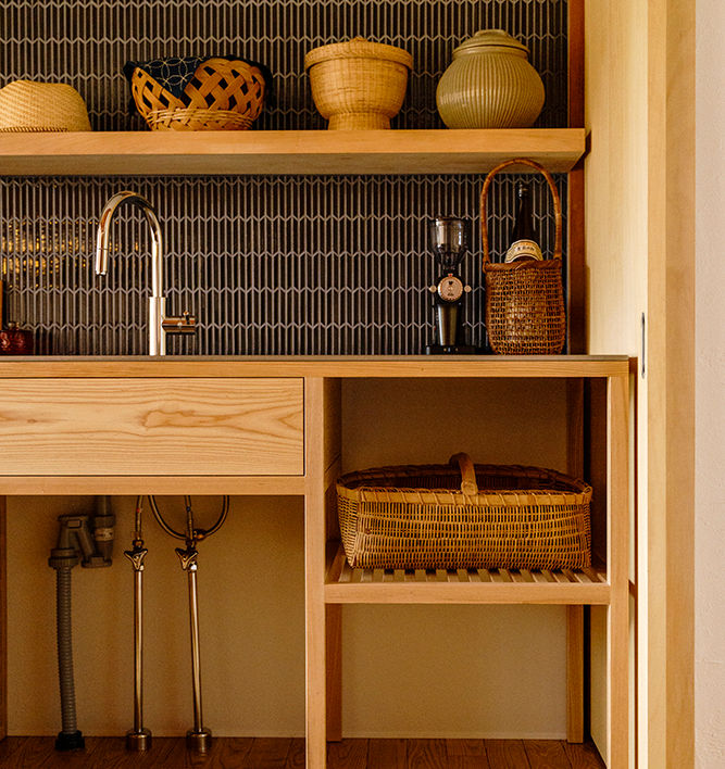 予算の大部分を劣化部の修繕に当てざるを得ない状況の中で、意匠や内装仕上げについては暮らしの中心となるLDKとその他の室でメリハリをつけたデザインを試みている。縁側・客間・仏間を仕切っていた襖や障子は撤去し、三間続きのLDKとして大胆に洋風の間取りに変更した。和風住宅の設えの醍醐味でもある欄間は残すことも考えたが、格天井を見せ、空間の広がりを感じさせるために開口部として撤去した。以前の床の間の場所には台所を設け、洋風の作りとしながらも簾張りのタイルや無垢の木のオーダーキッチン、左官仕上げの壁、フローリングを栗材とすることで既存の素材と調和が取れるようにデザインしている。その他の室は杉のフローリングとクロスの壁・天井の組み合わせとし、比較的に安価な材料で構成しながらも細部の納まりに気を配ることで野暮ったさを消したシンプルな空間とした。